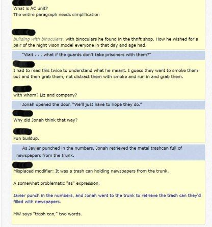 This is a screen shot of critique comments from a section of my current WIP. When I have more than one critique partner (and I always do), I can view all comments at once for each chapter. Then I can decide which changes to make based on the comments. A general rule is if more than one CP makes a comment about the same thing, it has to change, but sometimes I make a change based on a single comment if I agree with their point.