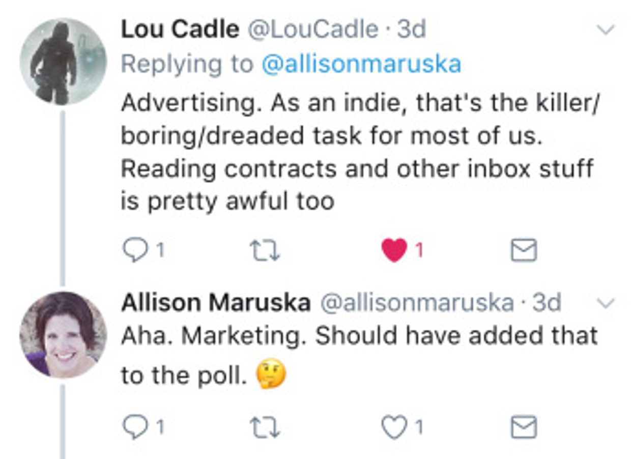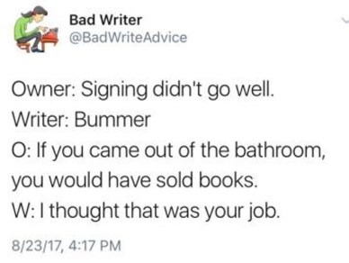 Marketing is a sticky point because, well, it kinda sucks. And by kinda I mean totally. Especially for us usually-introverted author types, having to talk about something we created and be excited about it isn’t natural at all. My alter-ego on Twitter gets it.