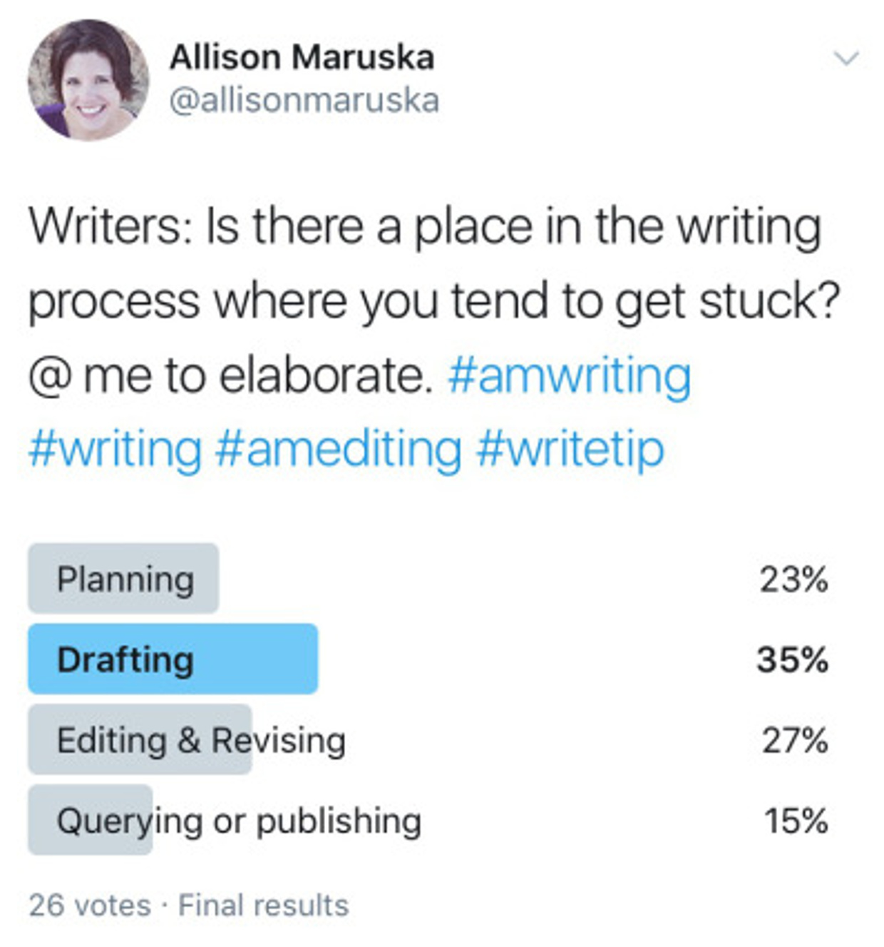It launched this whole mini-series on where writers get stuck. Be sure to check out planning, drafting, editing and revising, and querying or publishing if those are your personal struggles. While the poll was live, this comment happened:
